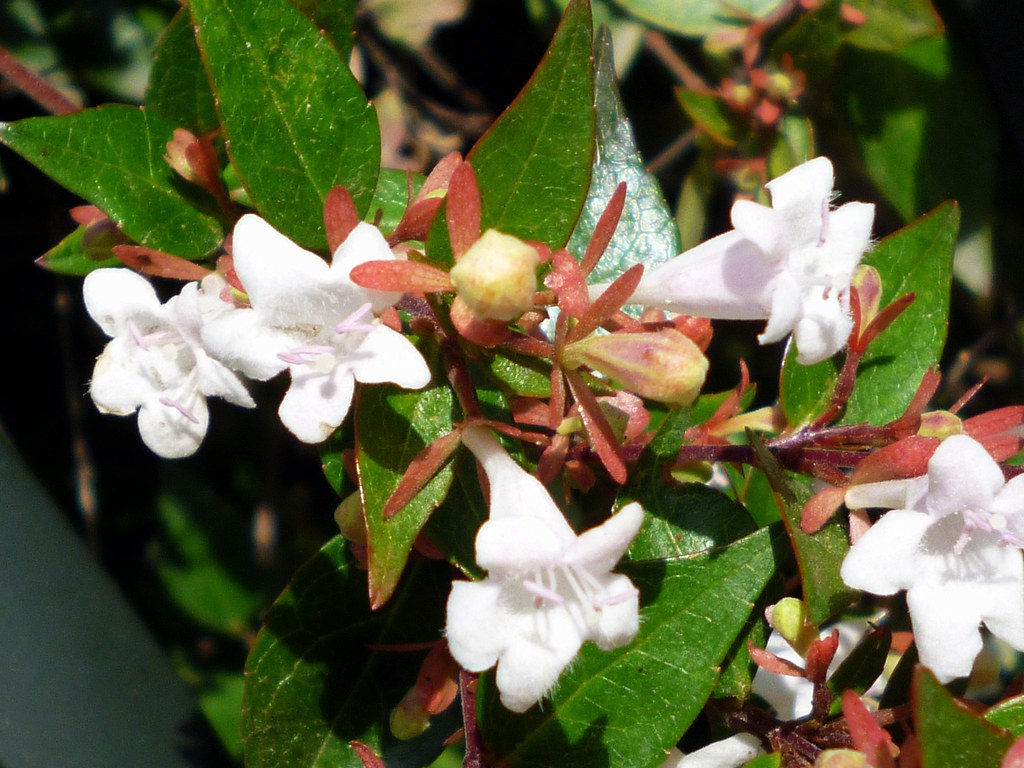 Sus flores son tubulares de 1-1,5 cm de largo, blancas que se encuentran dispuestas en inflorescencia en las extremidades de las ramas ligeramente perfumadas; quedando el cáliz en la planta tras la floración, dando a la abelia un color rojizo muy llamativo. En el caso de sus hojas, son opuestas, ovadas u ovado-lanceoladas, con los márgenes aserrados.