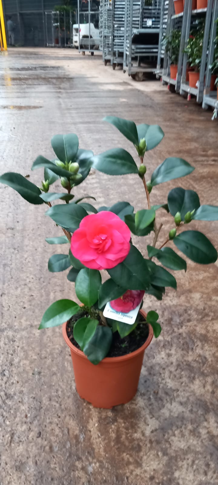 El arbusto de la camelia es perennifolio, por ello se mantiene bonito durante todo el año. Puede llegar a formar árboles de hasta 10 metros de altura. Se encuentra en jardines como planta individual o formando setos, y en grandes macetas para interiores. Las hojas son muy resistentes, de un tono verde oscuro y aspecto luminoso. Son anchas, con los bordes dentados y acabadas en punta. Por cada ápice de rama es posible que florezca una única flor de camelia. No poseen fragancia. Presentan un tamaño grande, los colores posibles son el blanco, rosa, rojo y cualquier combinación de éstas.