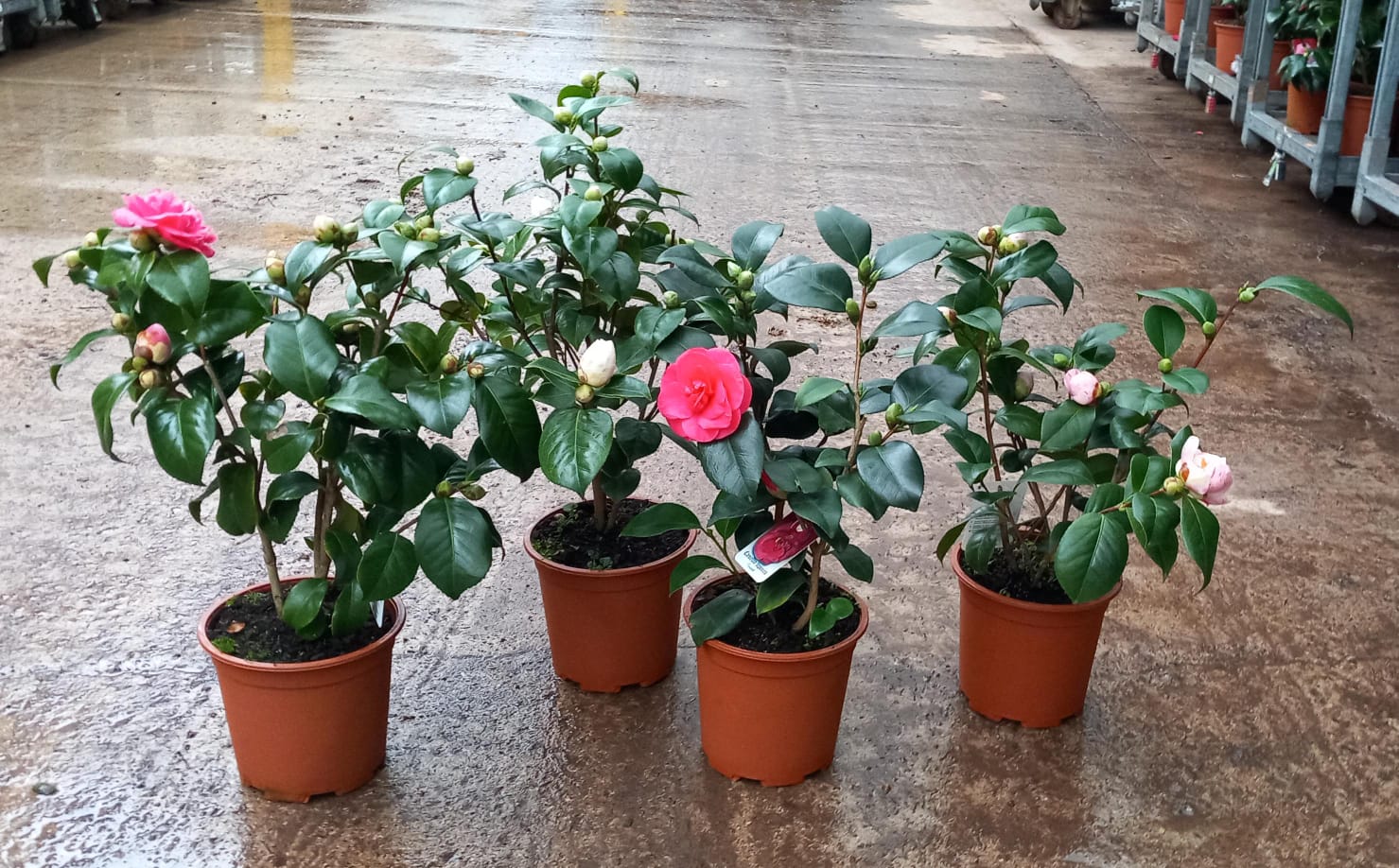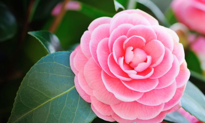 El arbusto de la camelia es perennifolio, por ello se mantiene bonito durante todo el año. Puede llegar a formar árboles de hasta 10 metros de altura. Se encuentra en jardines como planta individual o formando setos, y en grandes macetas para interiores. Las hojas son muy resistentes, de un tono verde oscuro y aspecto luminoso. Son anchas, con los bordes dentados y acabadas en punta. Por cada ápice de rama es posible que florezca una única flor de camelia. No poseen fragancia. Presentan un tamaño grande, los colores posibles son el blanco, rosa, rojo y cualquier combinación de éstas.