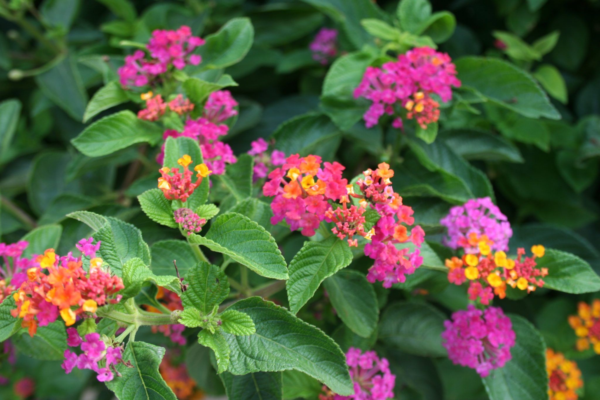 Este arbusto perennifolio, originario de zonas tropicales (Sudamérica), es muy utilizado en jardines mediterráneos, tropicales y de bajo mantenimiento. Puede alcanzar alturas de hasta 1,5 m y su crecimiento es rápido. Las hojas de la lantana son simples, con margen dentado, rugosas, ásperas y de color verde oscuro. Tiene un aroma característico. Las flores se agrupan en cimas y son, en este caso, en colores fucsia y amarillo.