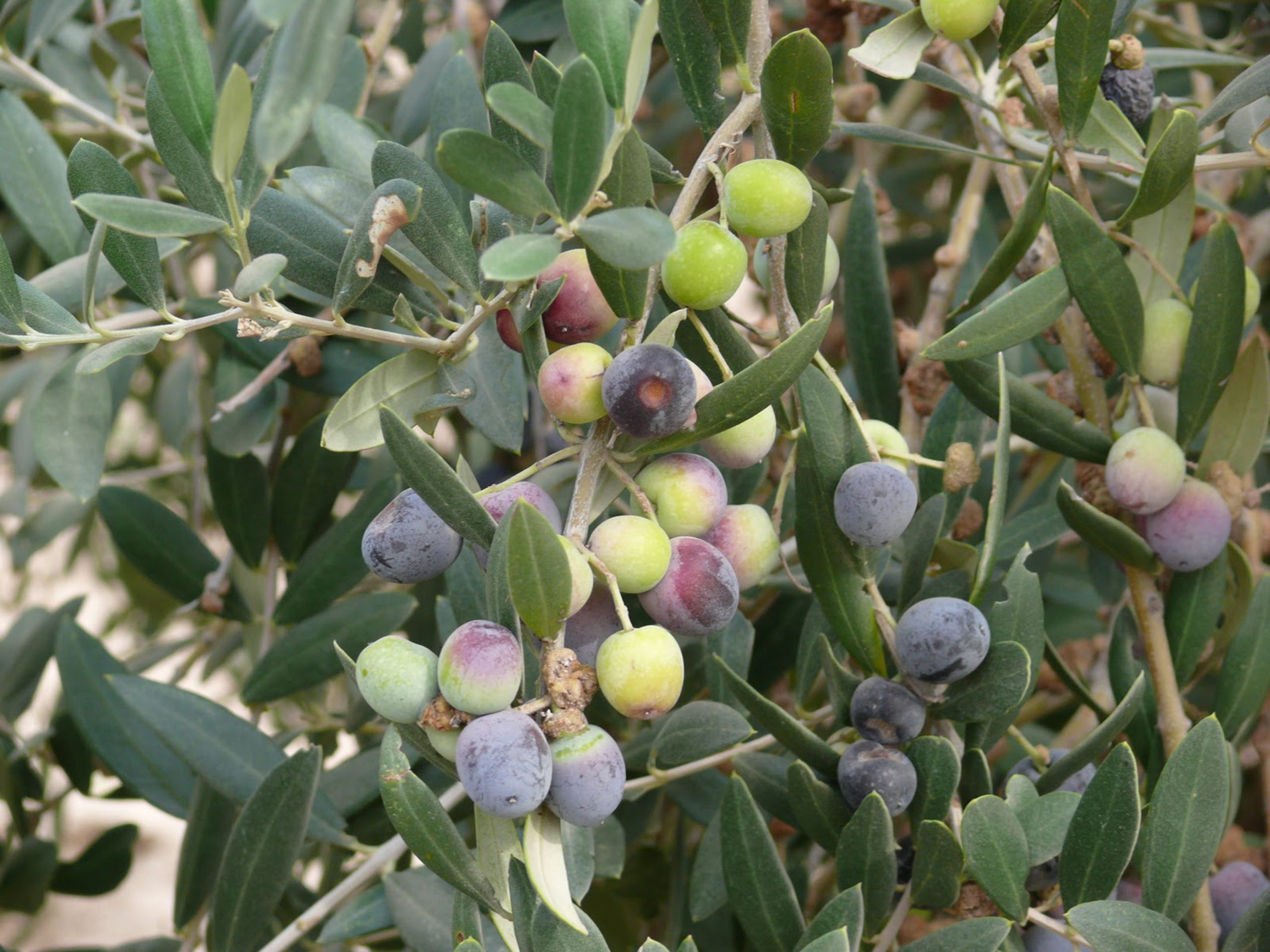Olea europaea, llamada comúnmente olivo, olivera o aceituno, es un árbol pequeño perennifolio, longevo, que puede alcanzar hasta 15 m de altura, con copa ancha y tronco grueso, de aspecto retorcido. Su corteza es finamente fisurada, de color gris o plateado. Tiene las hojas opuestas, de 2 a 8 cm de largo, lanceoladas con el ápice ligeramente puntiagudo, enteras, coriáceas, glabras y verdes grises oscuras por el haz, más pálidas y densamente escamosas por el envés, más o menos sésiles o con un peciolo muy corto.